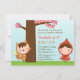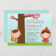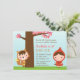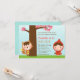 Pour les petites filles qui aiment le petit conte de fées rouge de capuchon, prévoyez une fête d'anniversaire de thème de conte de fées pour elle commençant par cette invitation mignonne de fête d'anniversaire ! Elle a une petite fille adorable dans un casquette rouge portant un panier tandis qu'un petit garçon dans le grand mauvais costume de loup se cache derrière l'arbre qui a le feuille rose. Personnalisez facilement avec vos détails de partie.