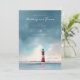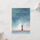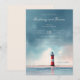 Cette invitation de mariage présente un thème de plage sereine avec un phare comme point central, sur un ciel dégradé passant du bleu doux à des teintes plus claires près de l'horizon. La palette de couleurs comprend des bleus atténués, des gris, un beige sablonneux et des rouges pour les bandes du phare, créant une atmosphère tranquille et romantique. Une typographie élégante est utilisée partout, avec des sections personnalisables pour les noms, les dates et les lieux, assurant une personnalisation tout en maintenant une mise en page propre et sophistiquée. Le design évoque un sentiment de chaleur et d'intimité, parfait pour les couples qui souhaitent célébrer leur jour spécial dans un cadre côtier.
