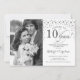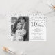 Carton d'invitation 10e anniversaire de mariage avec photo. Design élégant en argent et blanc avec police de caractères script et confettis de diamants. Peut être personnalisé pour afficher n'importe quelle année de mariage. À 10 ans de mariage, on trinque !