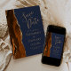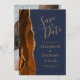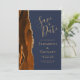 Cette élégante carte de date moderne dispose d'une bordure de géode d'aquarelle orange brûlée et bordée de parties scintillant en faux or. Le texte de couleur or apparaît sur un arrière - plan bleu marine. Remplacez facilement l'image de l'image de l'envers par votre photo verticale préférée.