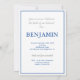 Une invitation de bébé garçon pour une Journée de Naming. Le modèle a une photo qui est facilement échangée contre votre propre image. Le modèle de conception est avec un texte bleu qui est facilement changé à vos informations. Choisissez parmi une gamme de types de papier. De Beaux Designs.