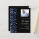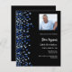 Une invitation moderne, élégante et raffinée. Un arrière - plan noir décoré de confettis bleus. Personnalisez et ajoutez une photo, un nom et des détails de la fête. Texte blanc. 1 feuille = 1 invite imprimé bord à bord.