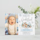 Photo Blue Silver Woodland Onederland 1st Birthday Invitation mignonne photo bleu et argent boisé hiver un derland thème invitation de premier anniversaire avec quatre animaux de bois mignons, quelques épingles, une bannière bleue, un cap de parties scintillant d'argent décoratif et des flocons de neige. L'invitation à l'anniversaire d'un an d'hiver dans les bois de ce garçon comporte également des points de parties scintillant en argent et un dos rayé bleu et argent.