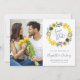Cette photo enregistre la carte de date comporte une couronne florale jaune et gris qui encercle les mots "Save the Date" dans un script d'écriture manuscrite gris blanc. Remplacez facilement l'exemple d'image par une photo de vous deux. Customisez le texte restant avec vos noms et la date et l'emplacement du mariage. L'envers est une teinte de gris solide qui correspond.