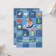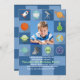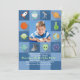 Une invitation parfaite pour l'anniversaire de votre passionné de l'espace. Le tableau de contrôle bleu sur le motif bleu comporte des icônes liées à l'espace et une fenêtre photo centrale.