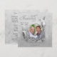 Invitation de photo d'anniversaire de mariage en argent ravissante avec un fond en damas floral gris argenté avec une ombre subtile de la lumière à l'obscurité. La zone avant affiche une bordure élégante de lys Calla et est prête à encadrer votre téléchargement de photo qui remplacera ce modèle de photo. Le texte artistique "25e anniversaire de mariage en argent" et le faux strass ajoutent un accent parfait. Personnalisez le texte avant et les zones de texte au dos de la carte avec vos informations. Le dos de la carte a un motif en damas floral assorti.