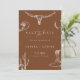 Célébrez votre amour avec cette carte "save the date" de mariage western rustique cowboy. Ce design présente des illustrations western dessinées à la main, y compris un crâne de longhorn, un cactus, des bottes de cowboy, un fer à cheval et un chapeau sur un fond chaud de terre cuite. Parfait pour les couples qui prévoient un mariage de style country, ranch ou western.