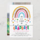 Invitation moderne de fête de fin d'études de maternelle. Le design présente un arc-en-ciel coloré avec des cœurs, une typographie script ''diplômé'' en lettrage tendance et les détails de la fête sur le devant et une photo sur le dos.