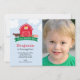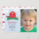Une invitation amusante à la fête agricole avec une illustration de grange rouge sucrée avec des animaux de grange ainsi que la photo du gamin d’anniversaire. Customisez avec les détails de votre fête. Le dos est constitué d'un motif simple avec les mêmes silhouettes de vache, de poulet et de porc que celles qui figurent sur l'illustration avant.
