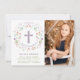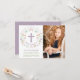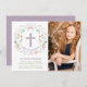 Cette carte d'invitation à la photo de la Première Communion moderne et branchée présente une couronne de fleurs illustrée encerclant une croix avec les mots "première communion" dans une police de caractères élégante. Le côté droit de la invitation comporte une zone de photos. Le texte et la photo peuvent être customisés à votre goût, tout comme la couleur arrière - plan de la carte (montrer en violet).