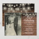 Personnalisez avec votre photo de mariage préférée et les détails de votre célébration spéciale du 50e anniversaire de mariage doré dans une typographie chic sur un fond en bois rustique avec des confettis de cœurs d'amour dorés éparpillés et des guirlandes lumineuses. Conçu par Thisisnotme©