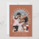 Faire-part élégant de mariage ou d'annonce de mariage intime en terre cuite. Le recto présente votre photo dans un cadre en arche et "Soirée pour toujours heureux" en typographie blanche élégante. Ajoutez vos prénoms, date de mariage et lieu. Au verso, personnalisez votre message et ajoutez vos noms dans une écriture semblable à une signature.