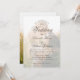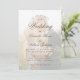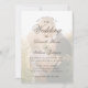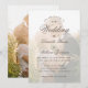 Sur le devant, il y a la même photo, mais rendue transparente et blanche. Le texte est dessus, en gris foncé (presque noir), avec le mot Mariage et les noms écrits dans un script calligraphique élégant, le reste en petites capitales. La première ligne, « Vous êtes invités à », est un texte arqué au-dessus du mot Mariage.