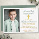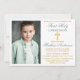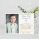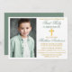 Invitation élégante moderne de Première Sainte Communion Vert Sauge et Or avec Croix et Photo.