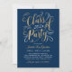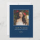 Célébrez avec style avec cette invitation de fête de fin d'études élégante avec un texte « Class of 2026 Party » en or sur un fond bleu marine profond. L'envers coordonné présente une mise en page de photo encadrée avec un style bleu marine assorti. Un look de calligraphie moderne classique pour les célébrations d'ouverture des portes des lycées.