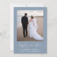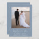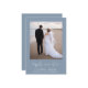 Élégant étage bleu poussiéreux ou petit faire-part mariage et invitation à la réception après le mariage. L'avant présente votre photo, "joyeusement toujours après" dans un script blanc élégant avec des swashes et vos noms, date mariage et emplacement. Au contraire, personnalisez votre faire-part mariage, ajoutez une invitation à la réception ou à la fête, entrez l'adresse de votre site Web mariage pour créer un code QR pour que les invités puissent scanner en ligne vers RSVP et signer vos noms mariés dans un script blanc de type signature.