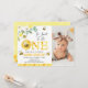 Photo Floral Honey Bee First Bee day Anniversaire Invitation Sweet bumble ou miel abeille thème de premier anniversaire invitation pour une petite fille avec un arrangement floral principalement jaune et quatre mignons bourdons abeilles et une zone pour une photo.