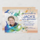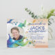 Des vagues de couleur fluide traversent l'invitation, composées de bleus et de verts, et se transforment en taupe et en gris. Une fenêtre circulaire de photos se trouve au centre. Convient à tout âge.