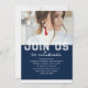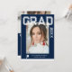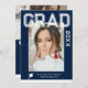 Photo Graduation Party Elégant Modern Script Invitations comprennent votre photo préférée avec le texte blanc simple "Grad (année)" et votre nom et les détails de graduation personnalisée sur le devant sur un arrière - plan bleu. Au verso, ajoutez une image supplémentaire avec les informations sur l'invitation de graduation ci-dessous. Personnalisez en modifiant le texte dans les zones de texte fournies. Créé par ©Evco Studio www.zazzle.com/store/evcostudio