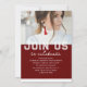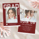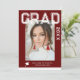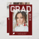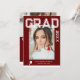 Photo Graduation Party Elégant Modern Script Invitations comprennent votre photo préférée avec le texte blanc simple "Grad (année)" et votre nom et les détails de graduation personnalisés sur le devant d'un arrière - plan bordeaux. Au verso, ajoutez une image supplémentaire avec les informations sur l'invitation de graduation ci-dessous. Personnalisez en modifiant le texte dans les zones de texte fournies. Créé par ©Evco Studio www.zazzle.com/store/evcostudio