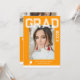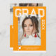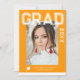 Photo Graduation Party Elégant Modern Script Invitations comprennent votre photo préférée avec le texte blanc simple "Grad (année)" et votre nom et les détails de graduation personnalisée sur le devant sur un arrière - plan orange profond. Au verso, ajoutez une image supplémentaire avec les informations sur l'invitation de graduation ci-dessous. Personnalisez en modifiant le texte dans les zones de texte fournies. Créé par ©Evco Studio www.zazzle.com/store/evcostudio