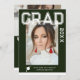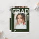 Photo Graduation Party Elégant Modern Script Invitations comprennent votre photo préférée avec le texte blanc simple "Grad (année)" et votre nom et les détails de graduation personnalisée sur le devant sur un arrière - plan vert. Au verso, ajoutez une image supplémentaire avec les informations sur l'invitation de graduation ci-dessous. Personnalisez en modifiant le texte dans les zones de texte fournies. Créé par ©Evco Studio www.zazzle.com/store/evcostudio