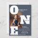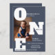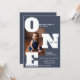 Une invitation moderne et audacieuse pour le premier anniversaire dans un bleu poussiéreux, avec des lettres "ONE" surdimensionnées pour un design propre et attrayant. Personnalisez-le avec votre propre photo pour en faire la vôtre. Une option exceptionnelle pour ceux qui recherchent une alternative sophistiquée aux invitations traditionnels "trop mignons" sur le thème du bébé.