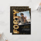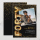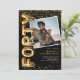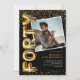 Invitation moderne pour les 40 ans avec un fond noir élégant, un modèle de photo à remplacer par le vôtre, une dispersion de confettis dorés, des ballons d'hélium dorés qui épellent "quarante", et un modèle de texte de fête élégant facile à personnaliser.