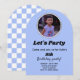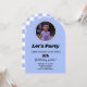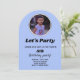 Invitation photo personnalisée arquée. Cette invitation personnalisée comprend une conception de photo arquée simple avec un texte personnalisé. Cette conception peut être entièrement personnalisée pour répondre à vos préférences. Cette invitation peut être utilisée pour les enfants et les adultes comme invitation pour un anniversaire. Elle a un joli fond bleu avec un motif croisé au verso.