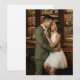 Cette invitation de mariage présente un design romantique et intime avec deux personnes dans une pose affectueuse, sur fond d'un bar élégant. La palette de couleurs chaudes comprend des bruns terreux provenant des étagères en bois et un vert olive doux provenant du costume d'une des personnes, contrastant avec la luminosité d'une robe blanche. La technique d'art photographique capture un moment réaliste et tendre, en mettant l'accent sur les expressions naturelles et les textures. L'ambiance générale est joyeuse et aimante, parfaite pour célébrer une occasion spéciale.