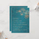This elegant wedding invitation features rose gold line art flowers on a teal/ peacock green background.