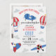 Photo Rouge bleu moderne Comment le temps vole 1er anniversaire Invitation Comment le temps vole l'invitation de premier anniversaire pour garçon avec deux avions, des montgolfières et des nuages. Cette invitation mignonne pour les garçons 1er anniversaire est idéale pour un avion de la fête d'anniversaire sur le thème du vol. Photo à l'arrière.