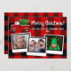 Ajoutez votre famille 3 ou badinez des photos avec le nom et l'année, carte de voeux de Noël d'amusement. Le vieux camion pick-up rouge antique avec l'arbre de Noël dans le lit, avec Noël de typographie de manuscrit le Joyeux, thème du sud de vacances de style de pays vintage adorable avec le motif de pays de plaid de buffle de contrôle de rouge et de noir impriment comme une chemise de flanelle.