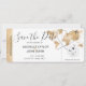 Destination Beach Wedding Boarding Pass Billet Gold Plane Économisez la Date avec l'icône coeur et avion avec des feuilles tropicaux.