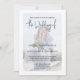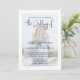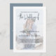 Ce design comprend une photo moderne simple et minimaliste, code QR rsvp via le site, scannable en ligne web digital, un texte de script élégant bleu poussiéreux, un couple de photos fiançailles recouvert blanc, un classique classique minimaliste simpliste, romantique calligraphie typographie police, design chic superposition vellum style, une moderne simple élégance rustique romantique avec détails mariages plus d'informations