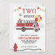 Modern Two The Secourt Fire Engine 2nd Birthday Invitation Le moteur d'incendie garçon mignon et dalmatiens thème invitation de deuxième anniversaire avec un moteur d'incendie, deux dalmatiens, drapeaux de bunting, tuyau de pompier et hydrant d'incendie. Cette invitation à l'anniversaire du pompier à thème secourt Deux présente également une photo au dos.