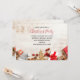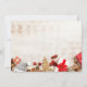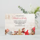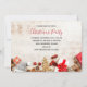 Une invitation à une fête de Noël avec une photographie rustique. Bois brun clair avec divers éléments de Noël le long du bas. Cadeaux de Noël, étoile, renne, boules et quelques fruits de saison.
