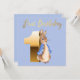 Pierre le lapin sur un Arrière - plan bleu avec l'or "Premier anniversaire" texte avec l'or numéro un.