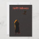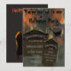 Scène de cimetière effrayante avec des pierres tombales avec brouillard, vautours, pleine lune orange, brindilles, texte en gris et noir. À l'arrière, une silhouette mystérieuse en noir et un merle volant au-dessus et texte Joyeux Halloween. Informations sur la fête sur les pierres tombales. Œuvre réalisée par PatriciaVilla sur Photoshop.