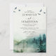 Une invitation à thème rustique de la forêt de pins de montagne aquarelle de la forêt mariage. La brume douce, sereine et éthérée, avec des oiseaux qui s'envolent au-dessus. typographie serif élégante, et le paysage forestier de montagne se poursuit à l'arrière de l'invitation. Bleus et verdure éthérés doux
