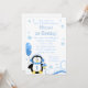 Un garçon mignon hiver onederland invitation fête d'anniversaire. Doté d'un pingouin, de cupcake, de tourbillons et de flocons de neige. Dans les tons bleu et blanc. Personnalisez facilement votre fête !