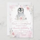 Invitation Pingouin Hiver Pastel Fleurs Roses Anniversaire