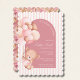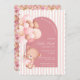 Celebrate your little girl's arrival with this Teddy Blooms & Golden Dreams baby shower invitation! Featuring a charming watercolor design, this invitation showcases a cute girl teddy bear holding a bouquet of pastel pink and brown balloons, framed by a soft arch backdrop with elegant pink stripes and mauve floral accents. The golden brown swirl details add a touch of warmth and sophistication, making it perfect for a modern and feminine baby shower. Available as a printable or digital file, this invitation coordinates beautifully with matching tableware, signs, favors, and thank you cards for a fully styled celebration.