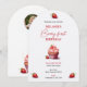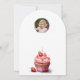 Cute Berry Première invitation anniversaire avec un cupcake rose et rouge à l'aquarelle avec fraises en forme de coeur et une bougie. Le texte est entièrement modifiable pour être personnalisé selon vos besoins. Insérez une photo de votre bébé à l'arrière pour une personnalisation totale. Disponible sous forme de téléchargement numérique ou d'invitation physique.