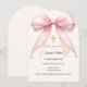 An arch shaped confirmation invitation. A soft ivory background, decorated with a pink large bow with pearls and a golden cross. Personalize and add a name and details details.