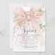 Blush pink watercolor coquette bow is decorated with roses and sage green greenery. A gold cross is placed above the text. The back is a chic pink and white stripe pattern. Your daughter's name is written in a beautiful calligraphy script. All text is editable.