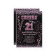 A modern design featuring a pink glitter number 21 with pink party ribbons and rhinestones. Customize the details for a chic Birthday Celebration.
