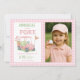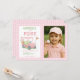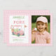 Golf theme girl's 4th birthday photo invitation. Turning Fore 4th Birthday Party Invitation with preppy gingham pink pattern and cute smile face pink golf cart. Get the par-tee started for your girl turning 4! Add her photo on the front of the invitation.