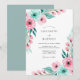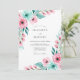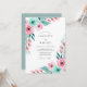 This design features a romantic watercolor palette of soft blush pink and vibrant teal. Delicate pink roses and smaller blossoms are paired with lush mint green and teal foliage to create a fresh, airy feel. The artistic botanical elements are arranged in a cascading style that evokes the beauty of a blooming meadow. Perfect for couples seeking a sophisticated and colorful aesthetic for their seasonal nuptials.
