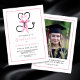 Invitation à la fête de remise des diplômes de l'école de soins infirmiers Pink Bow avec une photo de graduée au dos de l'invitation. Joli rayures rose et blanc, stéthoscope en forme de coeur avec un grand design tendance arc rose. Infirmière inscrite à la RN Invitation du parti de graduation. Ajoutez les détails de la fête de remise de diplômes à la famille et aux amis des invitations pour célébrer votre diplômé infirmier.